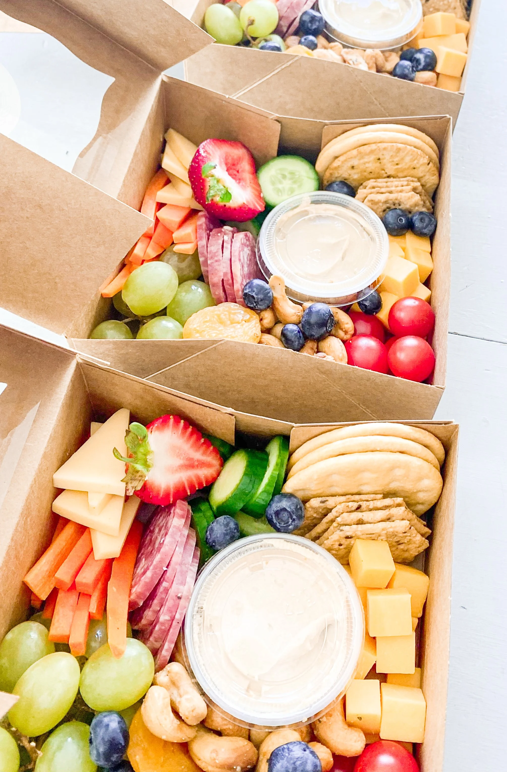 Includes cured meat, two different cheeses, fruit, veggies, crackers, nuts